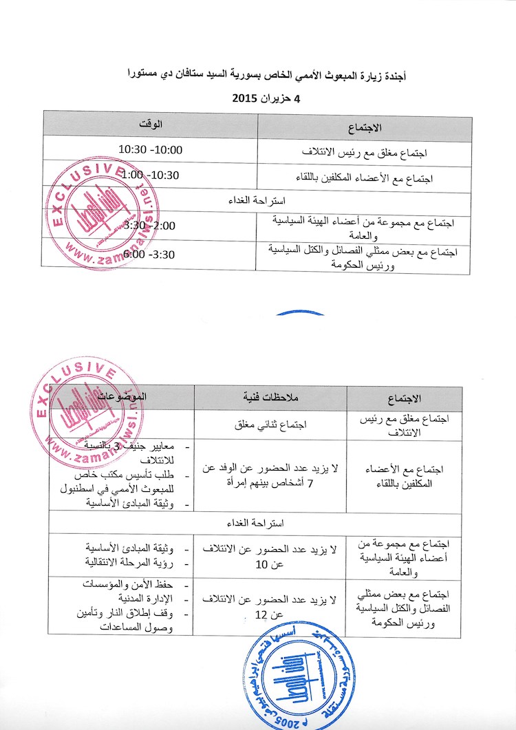 De Mistura also will meet with Ahmed Tomeh, head of Coalitions’ interim government, according to the meetings schedule.