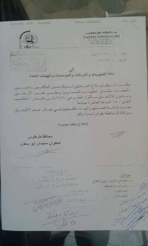 Tartus: Governor says all employees must follow military training or be fired
