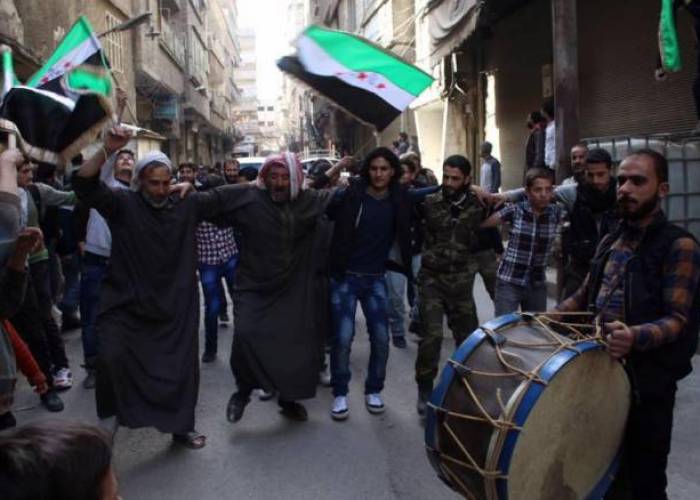 In eastern Syria, U.S.-backed rebels are pressing hard to take the Syrian-Iraqi border from the Islamic State, as regime army backed by a Russian cover makes advances near Palmyra, the capital of Syrian desert, activists said.