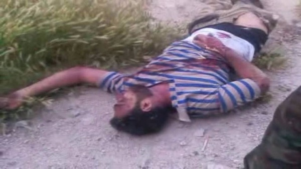 Yusuf al-Aji, a militant of regime militias has published a photo of a young man’s body after killing him, and another for his body after burning it, with comment: “this is the end of every armed man in Daraa”.