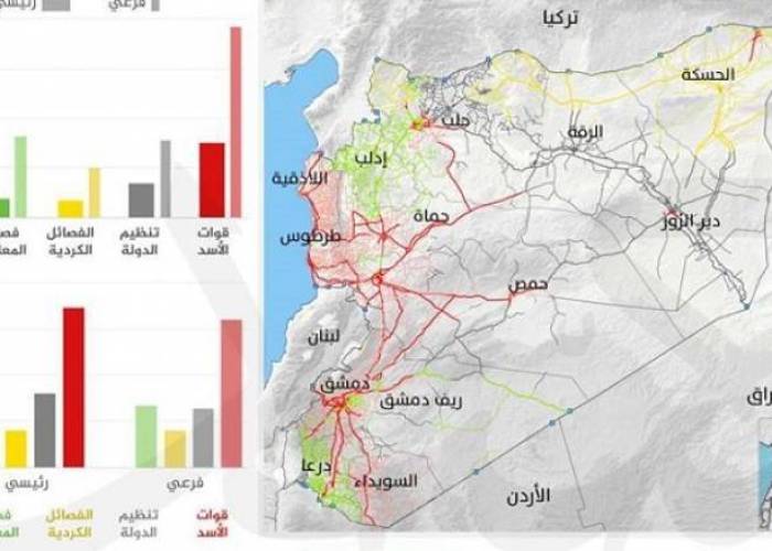 The data included with the map revealed the regime controls 4500 Km of main roads with 51.5% followed by ISIS controlling 2075 Km, 23.7% whereas rebel factions is ranked third controlling 1139 Km, 13% and last is the Kurdish militias controlling 1027 of main roads with 11.7%.