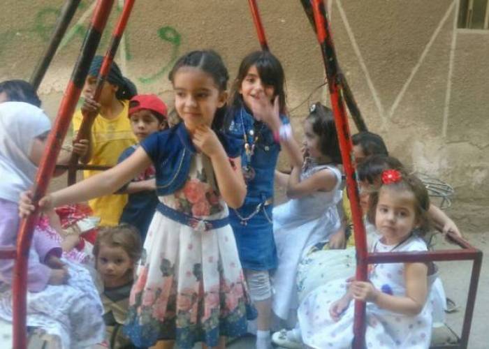 (Zaman al-Wasl) The regime and Islamic State siege did not succeed in preventing the Eid celebratory atmosphere, even a minimum level of it, from sneaking into al-Rejih Square in Yarmouk camp for besieged children to regain something from their childhood during Eid by playing with swings and other games despite their scarcity.