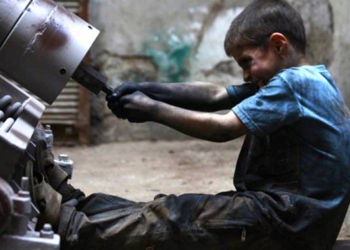 (Eqtsad)- Rabia, 12-year-old, carries his thin body which bends under the weight of the heavy Russian made rifle. He hangs it on his shoulder, passing over his neck and the collection of magazines and hand grenades.