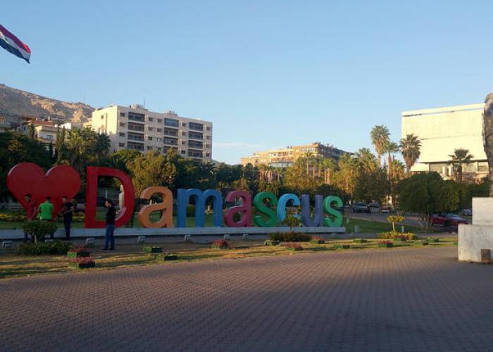 Elsewhere, people took selfies and loafed around a large “I love Damascus” sign — in English -- as cars and buses careened into the Umayyad roundabout. One couple took a seat within the folds of the “m” before snapping a picture. The sign, a nearby policeman says, was installed a little over a month ago.