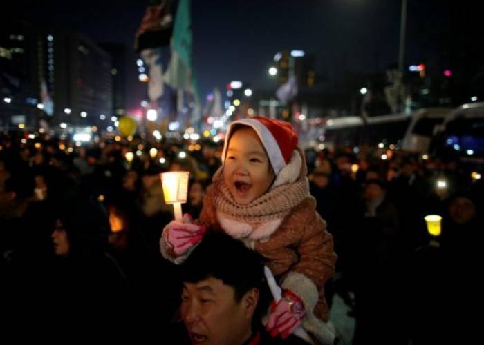 A large crowd of South Koreans took to the streets of central Seoul on Saturday for the ninth weekend in a row to demand the immediate resignation of President Park Geun-hye, who has been impeached by parliament over a corruption scandal.