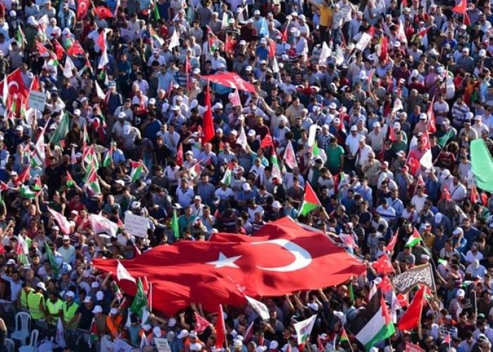 A mass of people, waving Palestinian and Turkish flags, chanted slogans such as "Istanbul and Jerusalem are arm-in-arm."