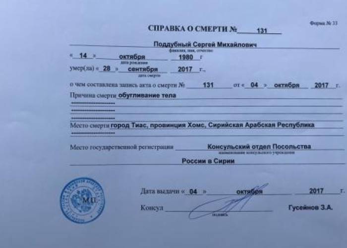 The document, a death certificate issued by the Russian consulate in Damascus dated Oct. 4, 2017, does not say what the deceased was doing in Syria.