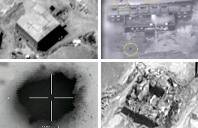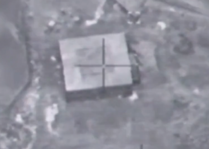 A series of black-and-white videos, taken above the target, shows the structure in cross-hairs. A male voice is heard counting down three seconds, a cloud of black smoke rises from the centre of the structure as it explodes. Other footage appears to show the aftermath - a smouldering hole in the ground.
