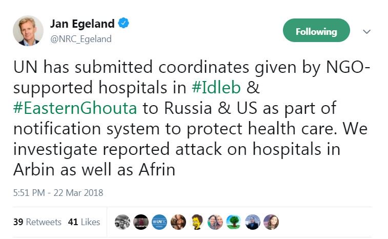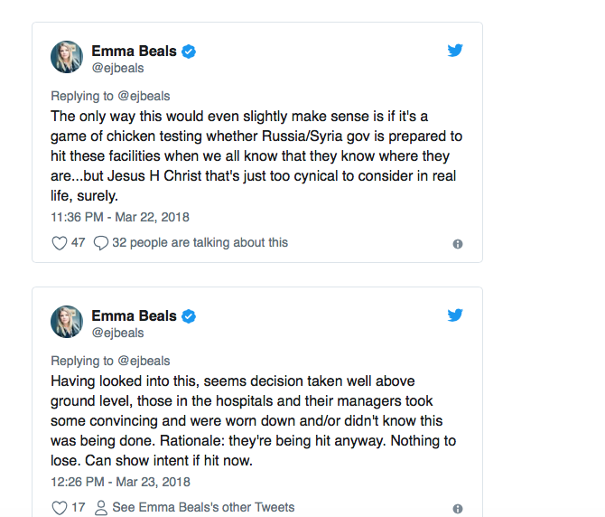 Journalist Emma Beals, who has reported on attacks on medical workers and facilities since 2013, summarized the risk of passing the coordinates given Russia’s involvement alongside the regime in deadly strikes. She searched for a logical motive by the UN, finally speculating that maybe the organization is testing Moscow and Assad’s forces: