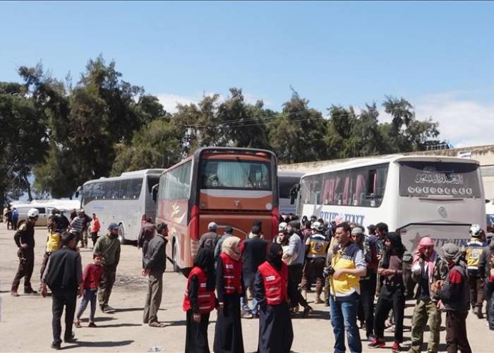The evacuations are part of a Russian-brokered agreement between Syria’s Assad regime and armed opposition groups.
