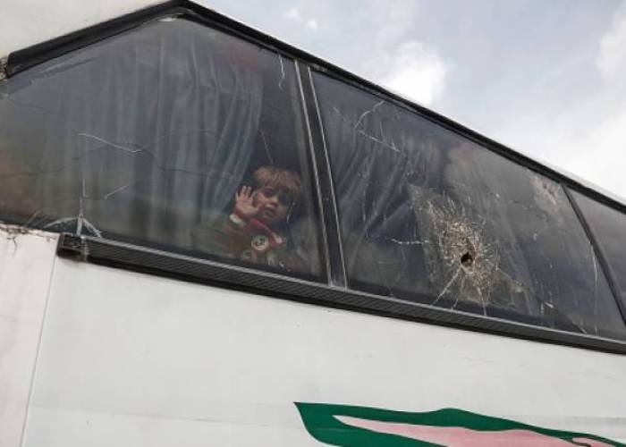 It showed images of buses moving in what it said was Al-Ruhayba, most with their curtains drawn.