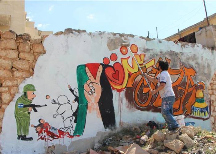 A Syrian graffiti artist is showing his solidarity with the people of the blockaded Gaza Strip by spray-painting pro-Gaza slogans and images on the ruins of opposition-held Idlib.