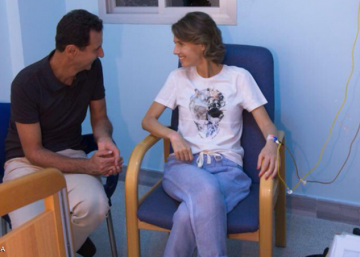 The presidency posted on its Facebook page a photo of Bashar Assad sitting next to his wife in a hospital room with an IV in her left arm. The accompanying statement said the "malignant tumor" was discovered in its early stages.