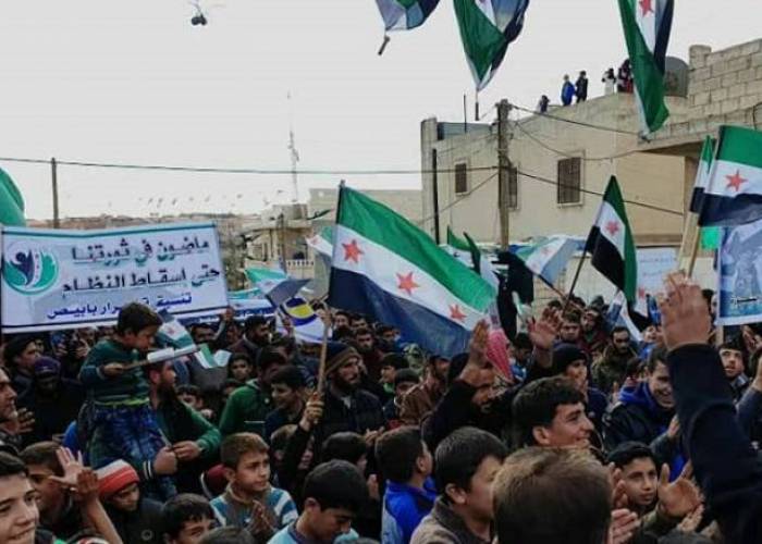 Demonstrators held up the three-star flag of the Syrian revolution and placards recalling the first days of the Syrian revolution in 2011, saying their goal is the toppling of the Assad regime and stopping the Russian aggression.