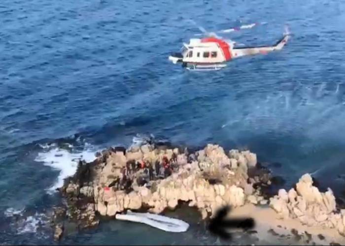 In a statement Monday, the coast guard said it dispatched two helicopters and one boat following a rescue request call by a migrant. Aerial footage showed groups of people on an island off the coast of the western province of Balikesir.
