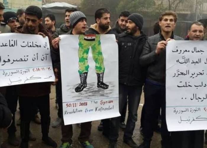 A remarkable demonstration took place in the famed village of Kafranbel after two of its prominent activists and citizen journalists, Raed al-Fares and Hamoud Junaid, were killed by Hayat Tahrir al-Sham militants last Friday.