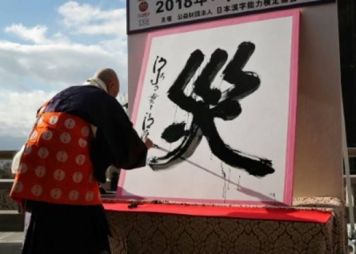Japanese TV stations broadcast the annual announcement live, with Seihan Mori, master of the ancient Kiyomizu temple in Kyoto, writing the character on a huge white panel with an ink-soaked calligraphy brush.