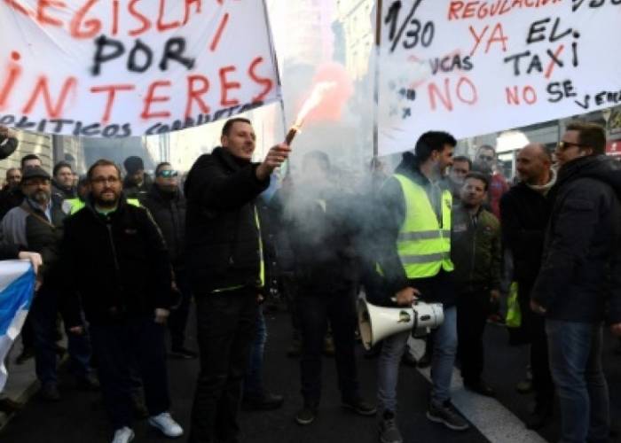 In the Spanish capital hundreds of striking taxi drivers gathered in the central Sol square outside the headquarters of the Madrid regional government as a police helicopter hovered overhead. Some set off firecrackers.