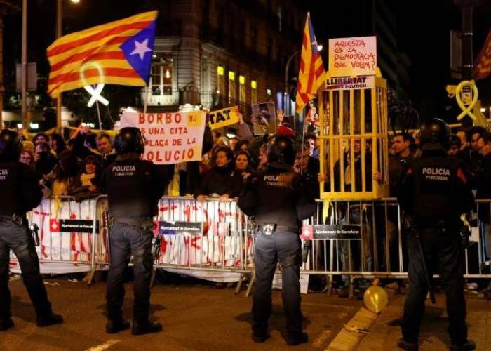 Protesters carried banners with slogans such as “Stop Repression” and “Rotten Bourbons”, referring to Spain’s royal house. They threw eggs at the regional police at the Museu Nacional d’Art de Catalunya (MNAC) where the dinner was held.