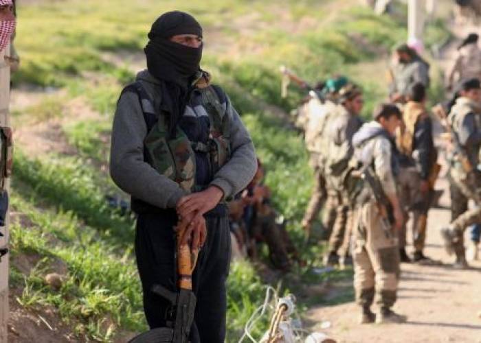 Holdout jihadists roam the settlement arms in hand.
