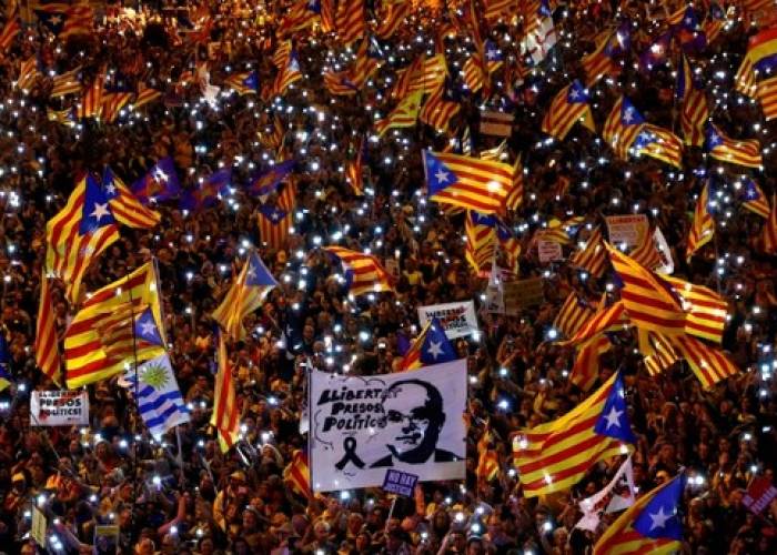 Many of the protesters carried the red-and-yellow striped flag of Catalonia, and a banner at the front of the march read: "Self-determination is not a crime".