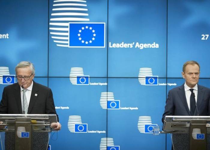 EU Council President Donald Tusk and EU Commission President Jean-Claude Juncker held a news conference following a two-day summit that focused on the economy, relations with China and fighting disinformation.