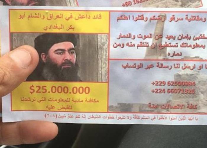 The leaflets carried pictures of Baghdadi and a promise of a reward of $25 million in return for information about his location.