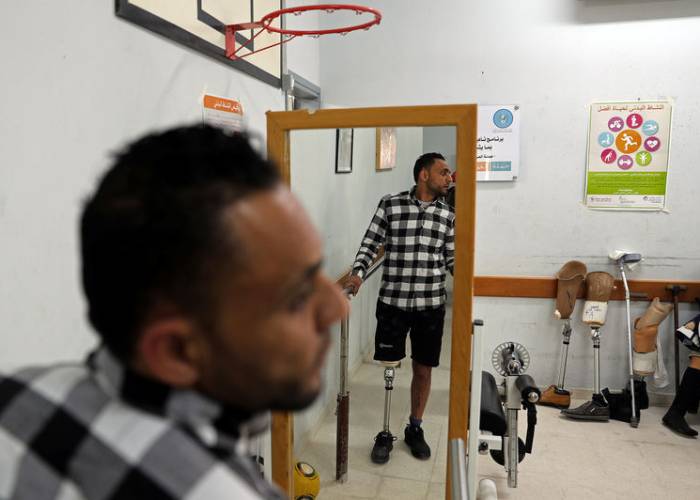 Walking up and down stairs at a Gaza medical center, Palestinian amputees are learning to use their new artificial limbs after being wounded by Israeli fire at border protests.