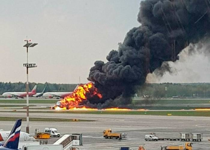 Television footage showed the Sukhoi Superjet-100 making an emergency landing at Moscow’s Sheremetyevo airport with much of the rear part of the plane engulfed in flames.