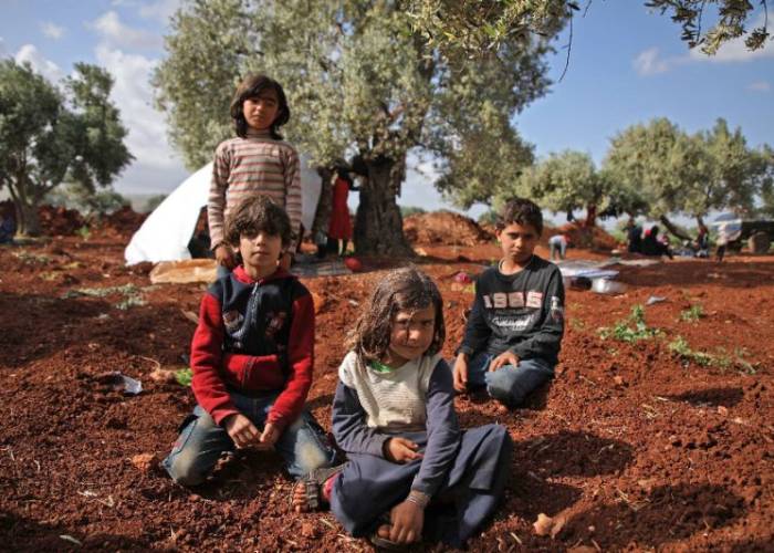 Families who fled Syrian government and Russian strikes in northwestern Syria are sleeping in an olive grove near the Turkish border without enough food and no place else to go.