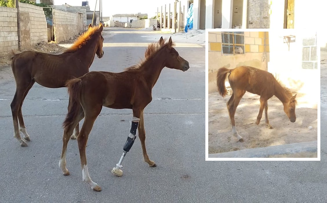 The leg of the 4-month-old 'Sham al-Agha' horse was amputated in the regime bombing on the western countryside of Aleppo.