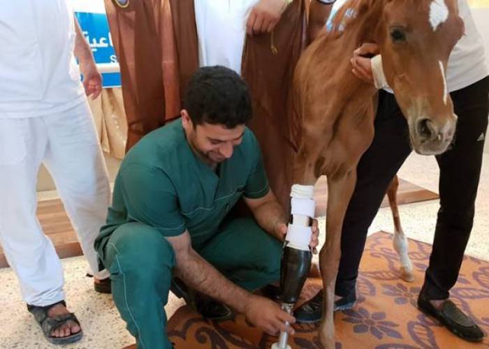 (Zaman Al Wasl)- An Arabic mare was fitted with prosthetic limb by local veterinarians in the northern town of Atareb after being wounded in regime shelling three months ago.