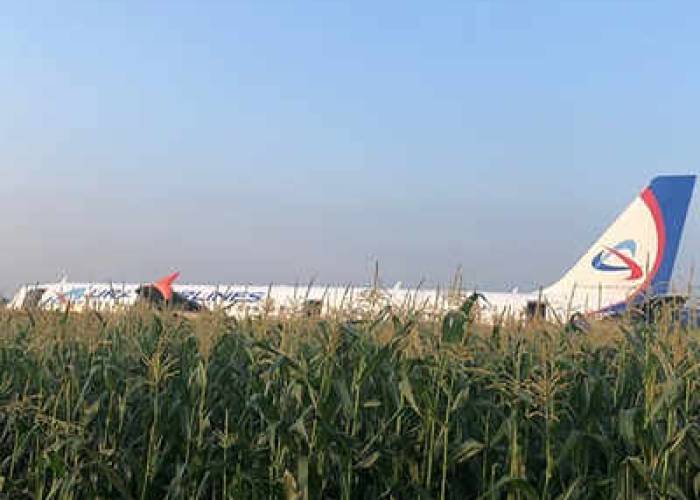 A Russian Airbus with more than 230 people on board was forced to make an emergency landing in a corn field outside Moscow on Thursday after hitting a flock of seagulls, officials said.