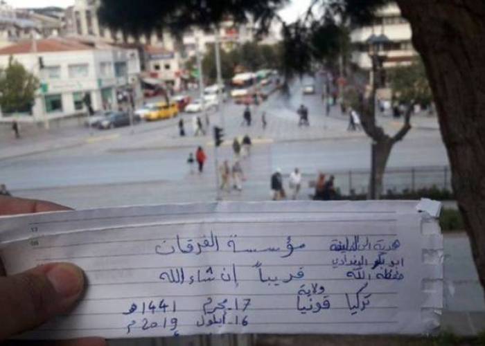 The unidentified suspect's post shows a view of the city from Aladdin Hill, with a hand holding a small paper with an Arabic note. The note says, "A gift to Caliph Abu Bakr Al-Baghdadi [Daesh leader]. Konya province of Turkey. Soon, inshallah."