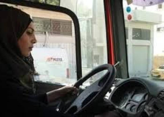 As the 30-tonne truck weaves through the crowded Palestinian streets, groups of men stop and gawp at the diminutive figure of Dalia al-Darawish in a purple headscarf seated behind the wheel.