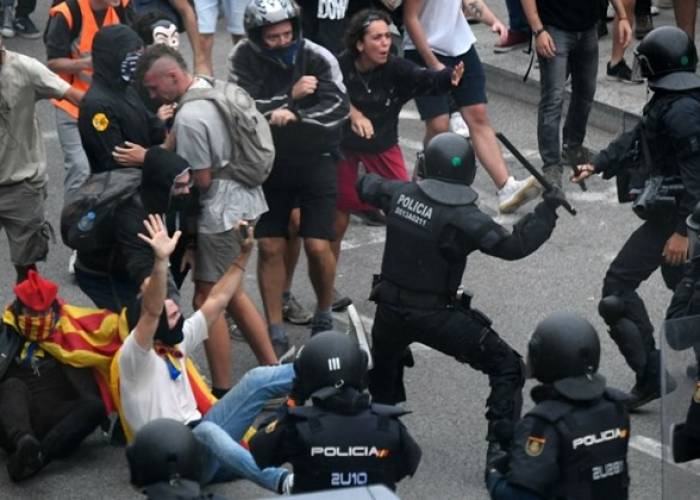 In Barcelona, police charged hundreds of masked demonstrators who threw projectiles at officers and set garbage containers and cardboard boxes on fire.