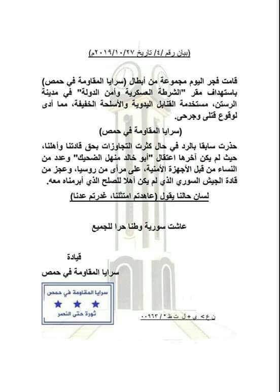The ‘Resistance Brigades in Homs’ said in statement posted online that its members had targeted the headquarters on the Military Police and the State Intelligence building in the town of Rastan.