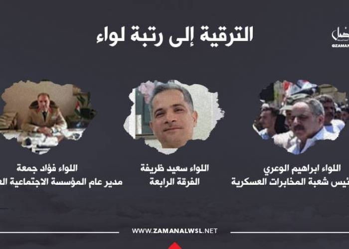 Zaman al-Wasl has obtained the names of the promoted Major Generals, who mostly come from Bashar al-Assad's hometown in coastal region and belong to the Alawite sect, an offshoot of Shiite Islam.