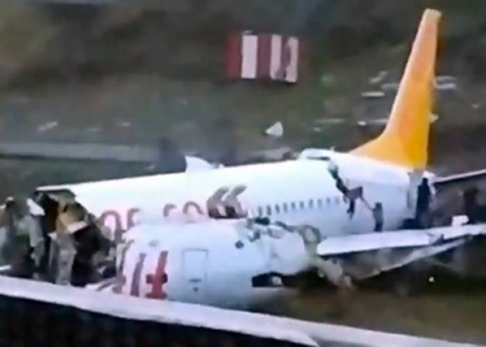Television footage showed serious damage to the plane, with the fuselage appearing to be broken into three pieces at Istanbul's Sabiha Gokcen Airport. NTV television reported the plane, which belonged to the low-cost airline Pegasus, arrived from the city of Izmir. NTV said it caught fire after skidding but said the blaze had been extinguished.