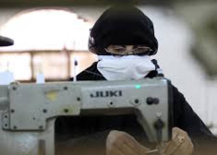 Lined up like factory workers, around 15 women have taken up positions in front of table-top sewing machines to produce face masks.