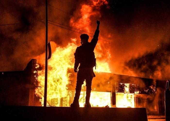 And as flames from a bank lick upwards nearby, the young man explains the anger seething across the country since the death of George Floyd on Monday at the hands of an officer who pinned him to the ground handcuffed and knelt on his neck for more than five minutes.