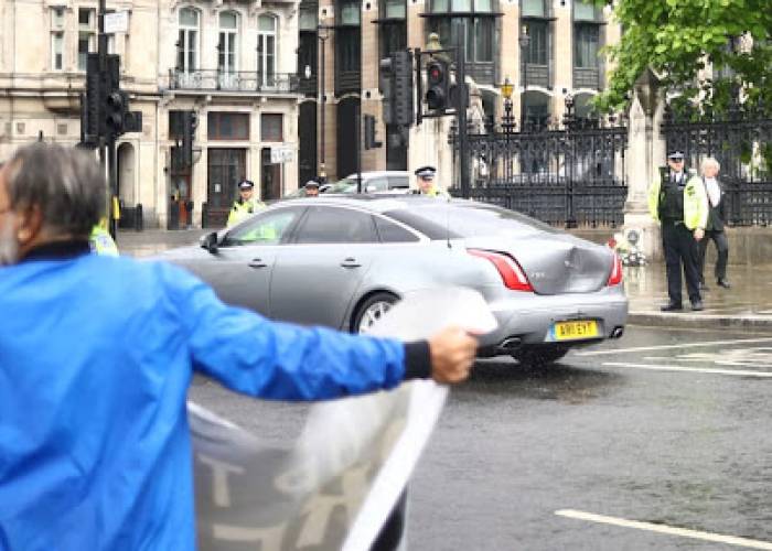 The car carrying British Prime Minister Boris Johnson was crashed into from behind in central London on Wednesday after taking evasive action when a pro-Kurdish demonstrator ran on to the road.