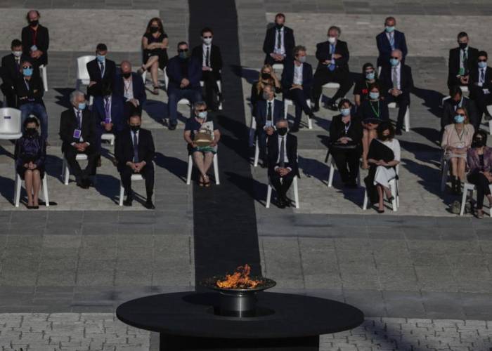 The guests, masked and seated in a socially distanced fashion surrounding a central cauldron, included representatives from a dozen religious organizations and ambassadors. The ceremony was shown live on television and online.