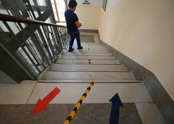 As well as special tape on the floor indicating the direction of movement, the school has added frequent hand sanitiser dispensers, provided by the Italian government which has pledged that 170,000 litres of disinfectant gel will be available per week across the country.