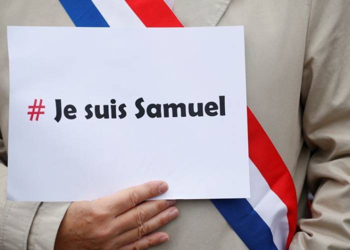 Some in the crowd chanted "I am Samuel", echoing the 2015 "I am Charlie" rallying call by supporters of free speech.