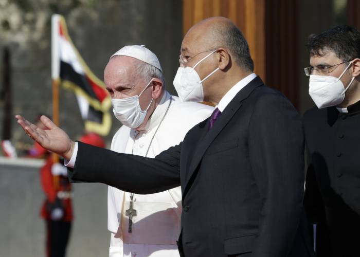 Salih greeted Francis outside the presidential palace. Both men wore masks as a band played the Vatican and Iraqi national anthems.