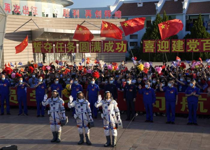 The astronauts are traveling in the Shenzhou-12 spaceship launched by a Long March-2F Y12 rocket that blasted off shortly after the target time of 9:22 a.m. (0122 GMT) heading into the bright-blue skies with near-perfect visibility at the launch center on the edge of the Gobi Desert.