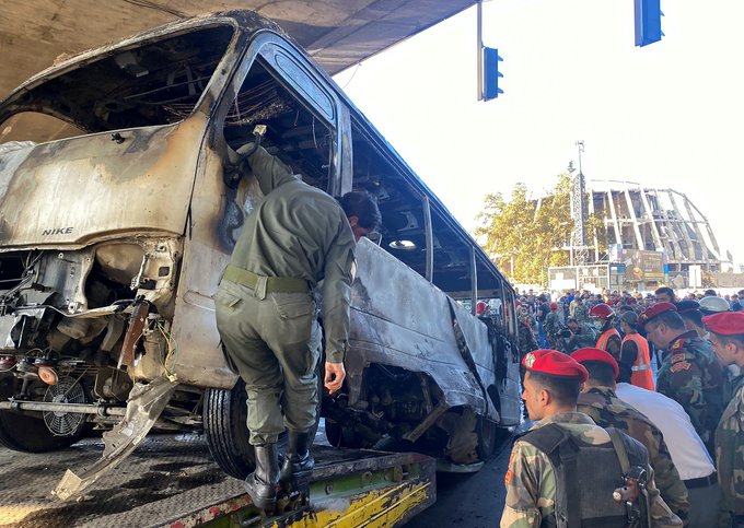 Syrian state TV showed footage of the charred bus in central Damascus, saying the blasts occurred while people were heading to work and school. The report said a third bomb was discovered and dismantled in the same area.