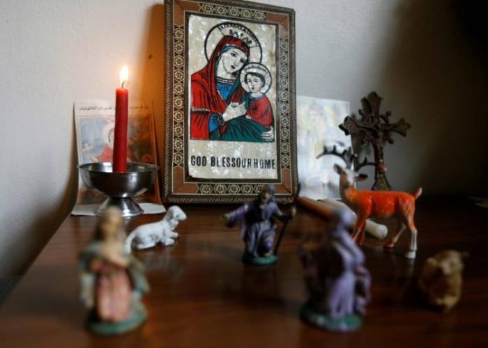 Religious statuettes and an icon seen inside the home of one Christian in Al-Qaryatain, which hasn't celebrated Christmas mass since 2015 LOUAI BESHARA AFP
