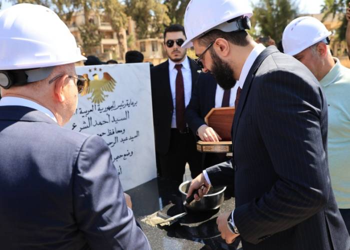 Syrian President Ahmed Al-Sharaa laid on Friday the foundation stones for two major development projects, Avenue Homs and Victory Boulevard, in Homs, central Syria, and met community leaders, according to the Syrian Arab News Agency (SANA).